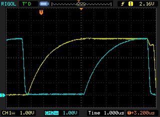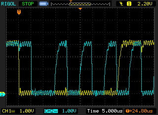 After the first long term tests (several hours & days), I observed that the Arduino froze after some time (sometimes after minutes, sometime after hours; with increasing amount of units decreasing time to freeze). After hours of debugging I came to the conclusion that it has something to do with the I2C communication. One of the slaves seemed to pull down SDA infinitely. However I had no oszilloscope to analyze the signal. A good reasion to buy one ;-.). That’s what I saw: